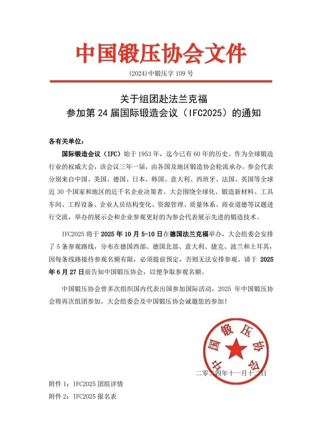 2025年10月5-10日,全球鍛造行業(yè)***高規(guī)格的盛會——第24屆國際鍛造會議在德國法蘭克福隆重舉行。作為全球鍛造界的"奧運(yùn)會",IFC2025匯聚了來自30個(gè)國家的近百名行業(yè)***。我司憑借在精密鍛造領(lǐng)域的技術(shù)實(shí)力和市場影響力,榮幸獲得中國鍛壓協(xié)會正式邀請,總經(jīng)理高仕恒代表公司隨中國代表團(tuán)參會,與全球鍛造精英共話行業(yè)未來。
